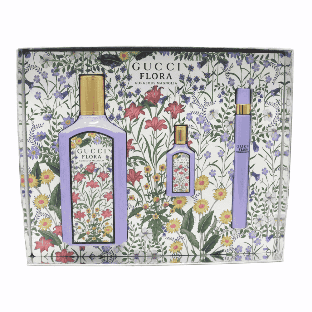 3-Piece Gift Set Includes Gucci Flora Gorgeous Magnolia EDP Natural Spray 100ml/3.3oz. Gucci Flora Gorgeous Magnolia EDP 5ml/0.16oz. Gucci Flora Gorgeous Magnolia EDP 10ml/33oz.